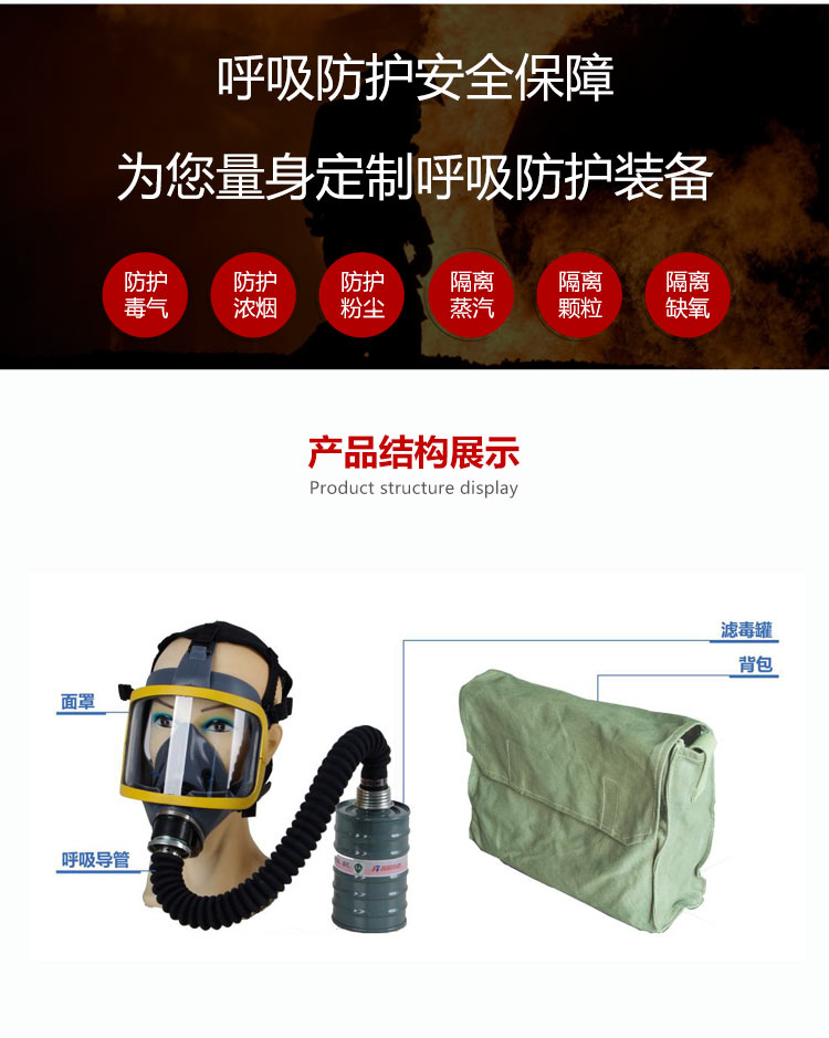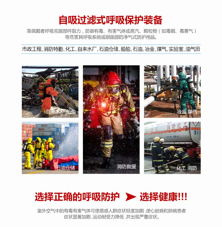 適用范圍:適合在有毒有害氣體污染環(huán)境、或缺氧窒息性災(zāi)害發(fā)生時使用,例如礦山自救逃生、高層樓宇逃生等,同時也可在石油化工、隧道工程等。